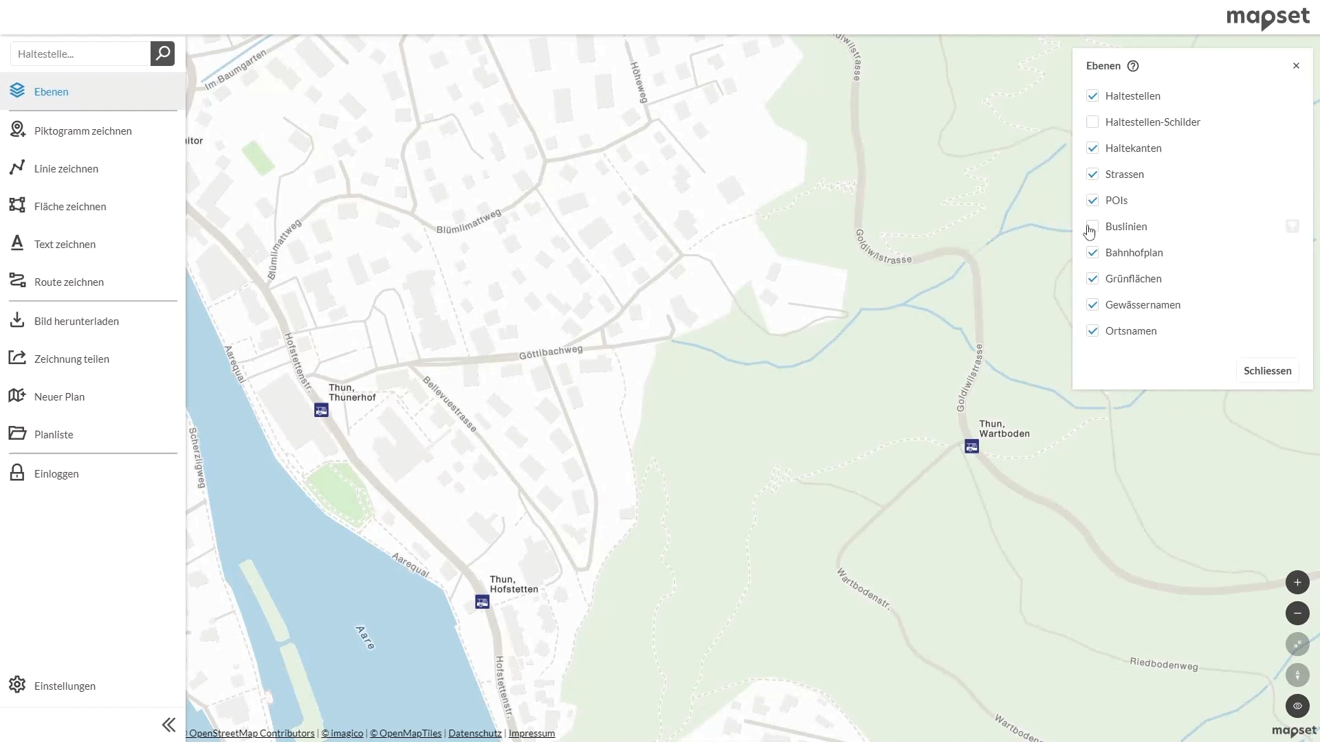 Aus diesem Grund sind diverse Layer in mapset ausblendbar. Neu können auch Gewässernamen und Ortsbezeichnungen ausgeblendet werden.